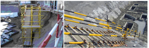 (8)深基坑施工應(yīng)設(shè)置扶梯、入坑踏步及專用載人設(shè)備或斜道等設(shè)施。采用斜道時,應(yīng)加設(shè)間距不大于400mm的防滑條等防滑措施。嚴(yán)禁沿坑壁、支撐或乘運土工具上下。