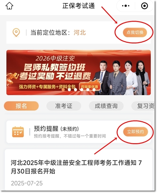 2.在頂部位置切換至自己所在的地區(qū),然后點擊“立即預約”,即可成功訂閱報名、準考證打印、查分等通知。