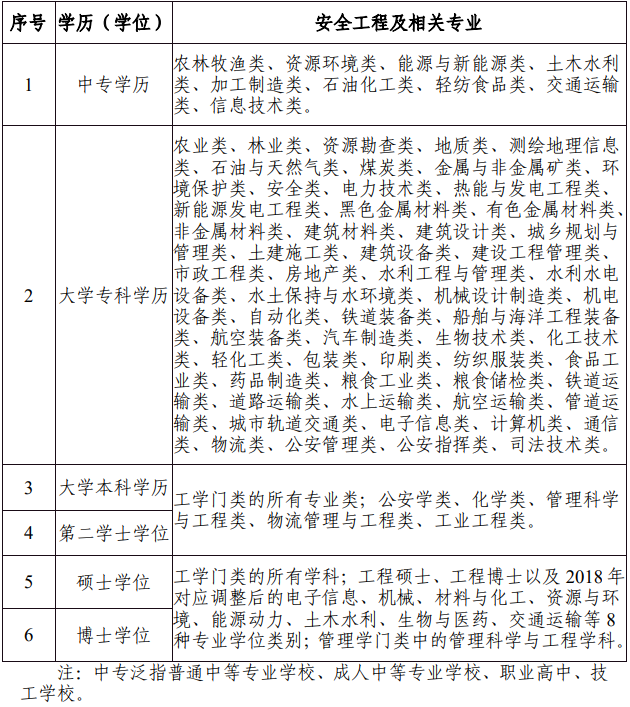 (一)具有安全工程及相關(guān)專業(yè)大學(xué)??茖W(xué)歷,從事安全生產(chǎn)業(yè)務(wù)滿5年;或具有其他專業(yè)大學(xué)專科學(xué)歷,從事安全生產(chǎn)業(yè)務(wù)滿6年;