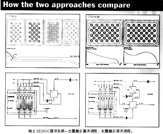 為了彌補(bǔ)傳統(tǒng)儲(chǔ)冰系統(tǒng)的這些缺點(diǎn),瑞士 DELROC AG 公司發(fā)展出了一套混合式(hybrid)的儲(chǔ)冰系統(tǒng)。這種系統(tǒng)的熱交換器管排(heat exchanger mats)系以穩(wěn)態(tài)聚丙烯(stabilized polypropy-lene)材料所制成,循環(huán)液依然是乙二醇。但是,此款機(jī)種的特性則為同步雙回路循環(huán),其目的系將「直接溶冰式」系統(tǒng)中的冷卻水回路整合于間接溶冰法的作業(yè)中,藉此來(lái)彌補(bǔ)先前所提之內(nèi)部溶冰原理的缺失。當(dāng)傳統(tǒng)「間接溶冰式」系統(tǒng)在執(zhí)行溶冰時(shí),儲(chǔ)冰(ice bank)與熱交換器管壁之間會(huì)逐漸形成寬大的間距,因此冰塊與熱交換器之間的熱傳能力會(huì)減低。但是在引進(jìn)了「直接溶冰式」系統(tǒng)中的冷卻水回路之后,冷卻水可將熱交換器無(wú)法完全吸收之熱再作二次吸收(詳附圖),以提高排熱效率。除此之外,經(jīng)過(guò)預(yù)冷的空氣會(huì)由儲(chǔ)冰槽的底部被置入槽水中,藉以攪拌提升槽水溫度的「均衡度」。