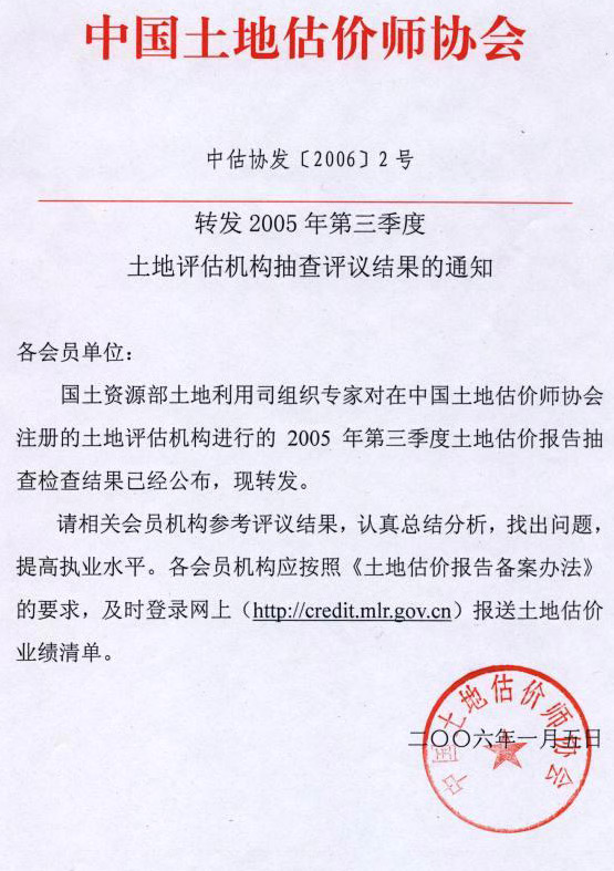 關(guān)于2005年第三季度土地評估機構(gòu)抽查評議結(jié)果的公示