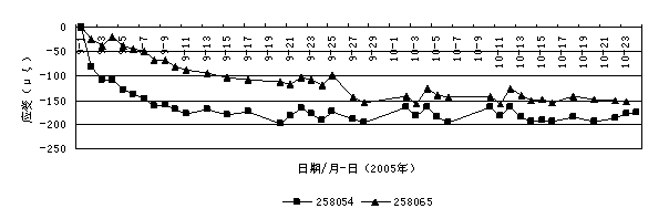 二次襯砌表面應(yīng)變量測在拆模后馬上進(jìn)行,準(zhǔn)備工作始于2005年8月下旬,量測工作從2005年9月1日開始,持續(xù)到10月23日(進(jìn)入冬季,天太冷,現(xiàn)場停止大規(guī)模施工)。