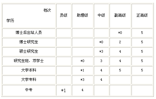 ?、诒碇兴心晗蓿杭?號為畢業(yè)后從事專業(yè)技術(shù)工作年限,對應(yīng)檔次為初聘專業(yè)技術(shù)職務(wù);無*號為該檔次職務(wù)的最低年限。