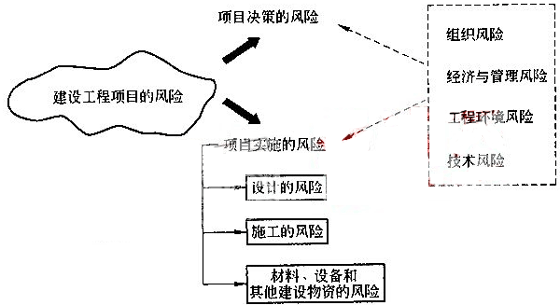 建設工程項目的風險包括項目決策的風險和項目實施的風險,項目實施的風險主要包括設計的風險、施工的風險以及材料、設備和其他建設物資的風險等(圖2Z101072)。建設工程項目的風險類型有多種分類方法,以下就構(gòu)成風險的因素進行分類。