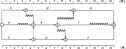 5.某工程雙代號時標(biāo)網(wǎng)絡(luò)計劃如下圖所示,其中工作E的總時差為( )周。【2006年試題】