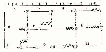 1、如圖所示時(shí)標(biāo)網(wǎng)絡(luò)計(jì)劃中,如果工作B、E、J使用同一臺(tái)施工機(jī)械并順序施工,則在合理安排的前提下,實(shí)施B、E、J三項(xiàng)工作時(shí)的施工機(jī)械閑置時(shí)間( )天。