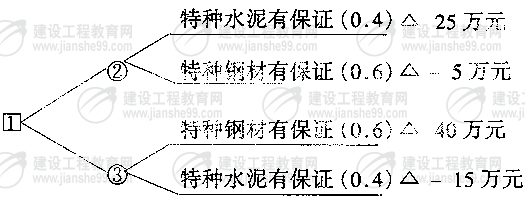 某高層商業(yè)大廈建設(shè)工程,由建設(shè)單位采購的特種水泥(防水工程用)和特種鋼材(鋼結(jié)構(gòu)工程用)的供應(yīng)均很緊張。為此,建設(shè)單位的有關(guān)部門正在外地聯(lián)系這兩種建筑材料的貨源。由于運輸能力等條件的限制,明年施工時只能保證這兩種建筑材料中的一種得到供應(yīng)。在此情況下,如果特種水泥得到保證,則防水工程的投資為25萬元,否則,將虧損5萬元。如果特種鋼材的供應(yīng)能得到保證,則鋼結(jié)構(gòu)工程的投資為40萬元,否則,將虧損15萬元。 (防水工程和鋼結(jié)構(gòu)工程不受施工程序和工期方面的限制)根據(jù)所掌握的情報資料,預(yù)計明年得到特種水泥保證供應(yīng)的概率為0.4,得到特種鋼材保證供應(yīng)的概率為0.6.