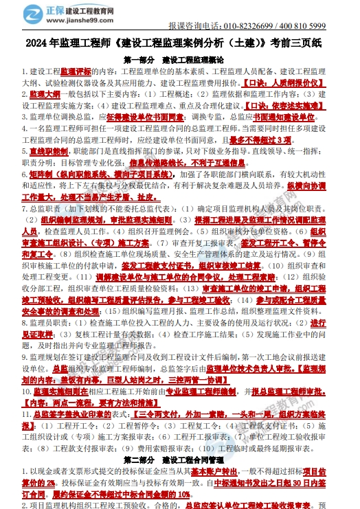建設(shè)工程教育網(wǎng)的老師們精心整理了2024年監(jiān)理工程師土建案例考前三頁紙,免費發(fā)給大家,臨時抱佛腳也是有用的,趕快來領(lǐng)取吧~