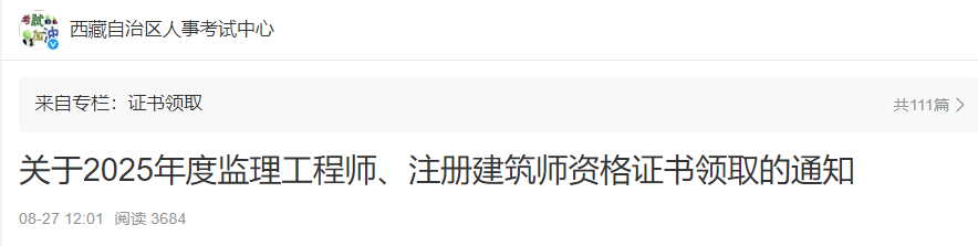 西藏考區(qū)2025年度監(jiān)理工程師資格證書領(lǐng)取通知已發(fā)布,詳細(xì)內(nèi)容如下: