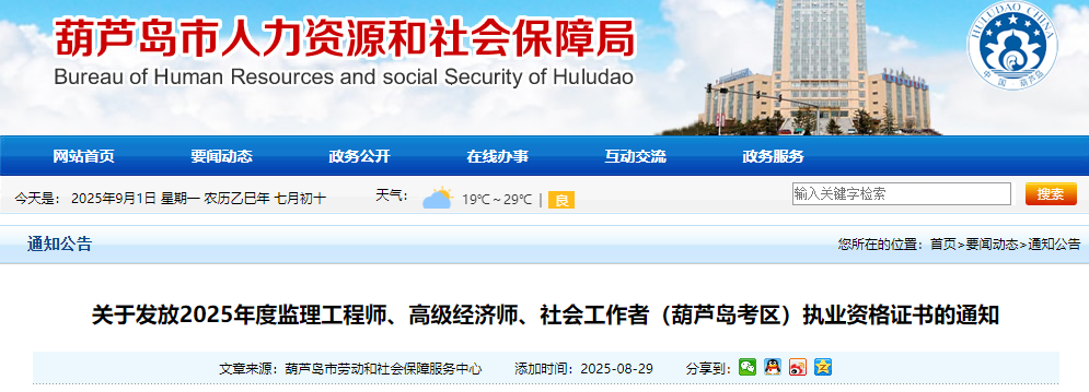 葫蘆島市定于2025年9月1日開始發(fā)放2025年度監(jiān)理工程師、高級經濟師、社會工作者(葫蘆島考區(qū))職業(yè)資格證書,為方便考生領取現將有關工作安排如下: