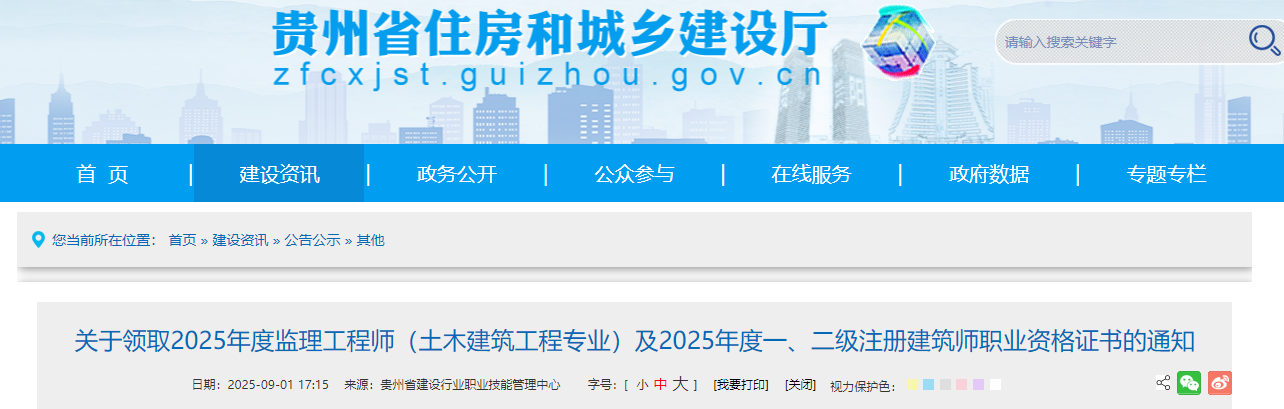 貴州考區(qū)2025年度監(jiān)理工程師(土木建筑工程專業(yè))證書領(lǐng)取通知