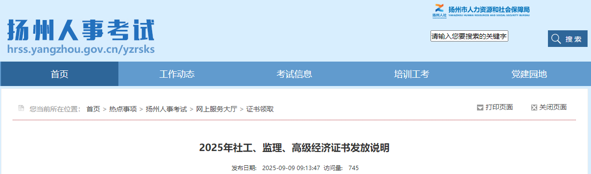2025年社會工作者、監(jiān)理工程師、高級經(jīng)濟師證書已到??忌傻卿浗K省人事考試網(wǎng)上業(yè)務(wù)辦理平臺(jiangsu.nomax.vip/bas)申請到付郵寄,現(xiàn)場發(fā)放地址邗江中路98號(市考試中心位于揚州市工業(yè)職業(yè)技術(shù)學(xué)院內(nèi)華揚樓東側(cè)一樓服務(wù)大廳,請配合學(xué)校保衛(wèi)進行登記,證書憑考生身份證原件領(lǐng)?。?。