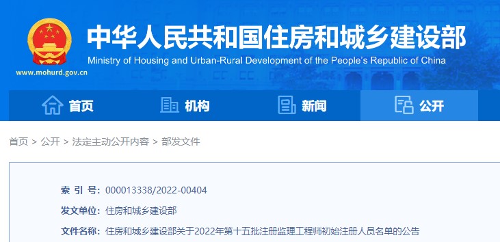住建部關(guān)于2022年第十五批注冊監(jiān)理工程師初始注冊人員名單的公告