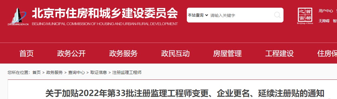 北京市關(guān)于加貼2022年第33批注冊(cè)監(jiān)理工程師變更、延續(xù)注冊(cè)貼的通知