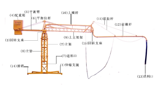 混凝土布料機是泵送混凝土的末端設備,其作用是將泵壓來的混凝土通過管道送到要澆筑構件的模板內(nèi)。請看下圖: