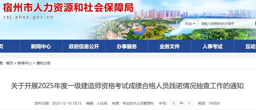 宿州市人力資源和社會保障局發(fā)布關于開展2025年度一級建造師資格考試成績合格人員踐諾情況抽查工作的通知,具體信息如下: