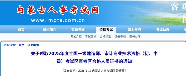 內(nèi)蒙人事考試網(wǎng)發(fā)布關(guān)于領(lǐng)取2025年度全國(guó)一級(jí)建造師、審計(jì)專(zhuān)業(yè)技術(shù)資格(初、中級(jí))考試區(qū)直考區(qū)合格人員證書(shū)的通知,具體信息如下: