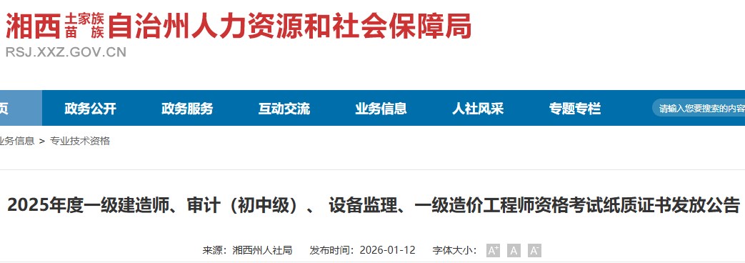 湘西自治州人力資源和社會(huì)保障局發(fā)布2025年度一級(jí)建造師、審計(jì)(初中級(jí))、設(shè)備監(jiān)理、一級(jí)造價(jià)工程師資格考試紙質(zhì)證書(shū)發(fā)放公告,具體信息如下: