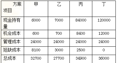 某企業(yè)有甲、乙、丙、丁四個現(xiàn)金持有方案,各方案的現(xiàn)金持有量依次是6000元、7000元、84000元和120000元。四個方案的機會成本均為現(xiàn)金持有量的10%,管理成本均為24000元,短缺成本依次是8100元、3000元、2500元和0元。若采用成本分析模式進行現(xiàn)金持有量決策,該企業(yè)應采用( )方案。