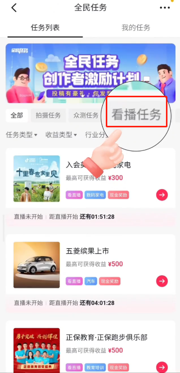 2.進(jìn)入“全民任務(wù)”列表頁—點(diǎn)擊“看播任務(wù)”