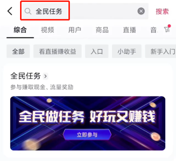 1.打開抖音點(diǎn)擊搜索,輸入“全民任務(wù)”
