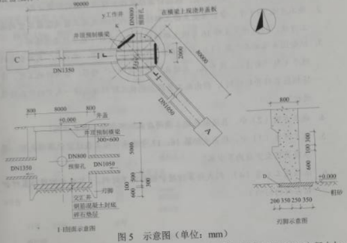 某項目部承接一項頂管工程,其中DN1350mm管道為東西走向,長度90m;DN1050mm管道為偏東南方向走向,長度80m。設(shè)計要求始發(fā)工作井y采用沉井法施工。接收井A,C為其他標(biāo)段施工(如圖5示)。項目部按程序和要求完成了各項準(zhǔn)備工作。