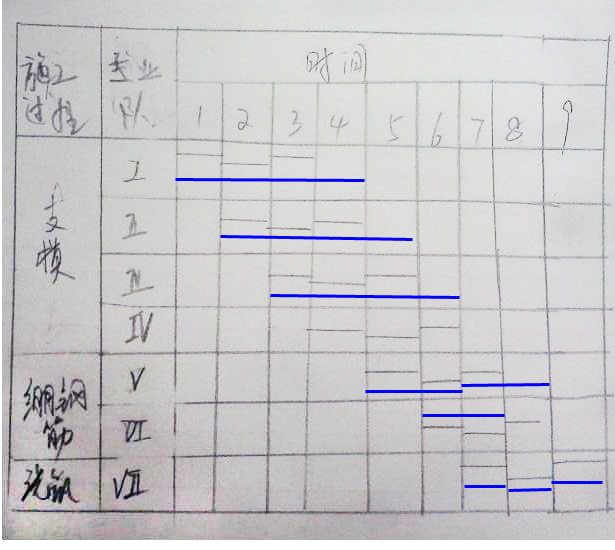 學(xué)生下載了老師的橫道圖,如果按照張福生老師的思路,藍線才是正確的,您會發(fā)現(xiàn),其實支模只要3個專業(yè)隊,最后的工期也是9天,但是根據(jù)藍線,有一個地方的流水步距不是1天,而是2天,因而這就不符合成倍節(jié)拍的定義(也就是說,僅僅是為了滿足成倍節(jié)拍的特征,白白多加了1個專業(yè)隊)。所以也就驗證了我一開始說的:如果專業(yè)隊數(shù)大于施工段數(shù),成倍節(jié)拍是無法組織的,或者說沒有必要組織