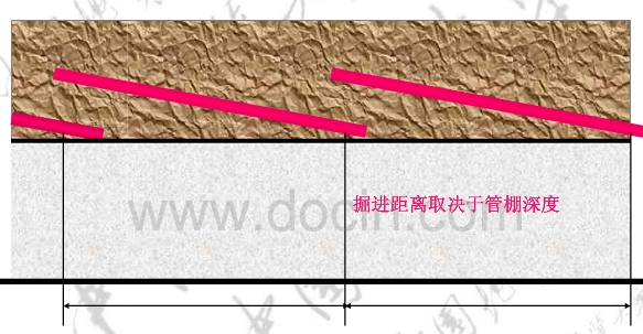 參考這個圖,管棚有一個斜向的仰角,挖掘距離到了黑色豎線的位置,那么先支下一節(jié)管棚