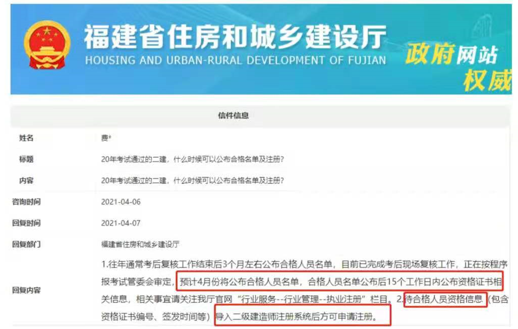 福建省住房和城鄉(xiāng)建設(shè)廳網(wǎng)站消息顯示,2020年福建二級(jí)建造師預(yù)計(jì)4月份公布合格名單,待合格人員資格信息導(dǎo)入二級(jí)建造師注冊(cè)系統(tǒng)后方可申請(qǐng)注冊(cè)。