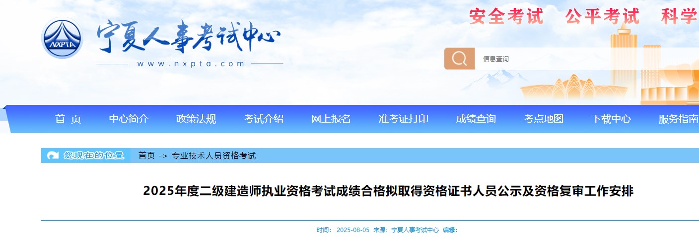 寧夏人事考試中心發(fā)布2025年度二級建造師執(zhí)業(yè)資格考試成績合格擬取得資格證書人員公示及資格復審工作安排,具體信息如下: