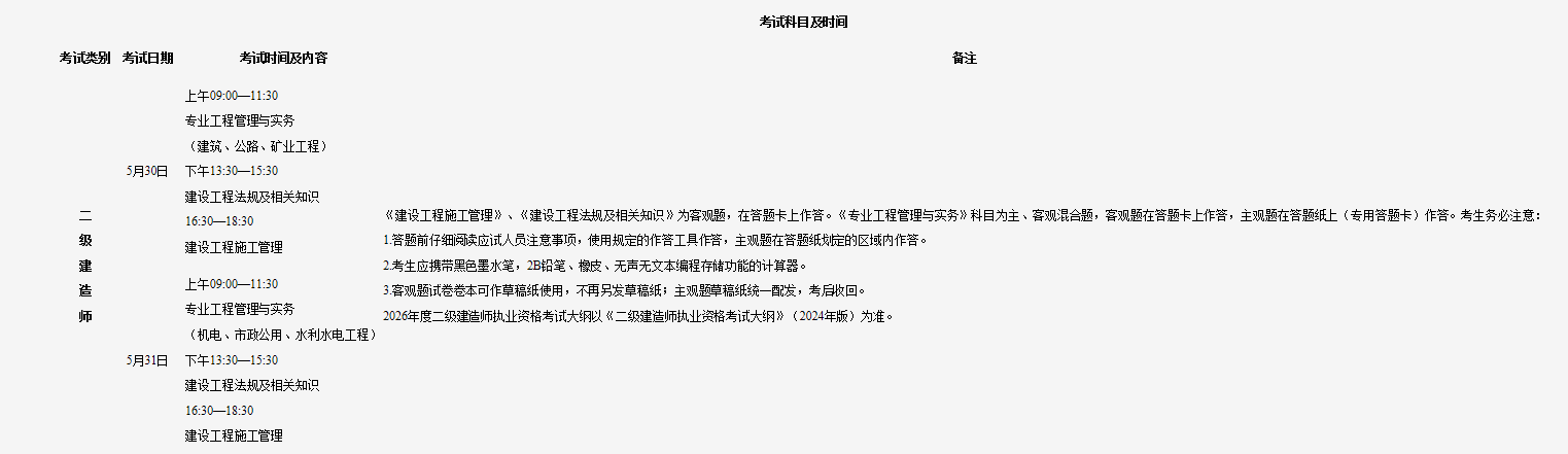 根據(jù)有關(guān)工作部署,2026年度二級建造師執(zhí)業(yè)資格考試定于5月30日、31日舉行。為做好我省2026年度二級建造師執(zhí)業(yè)資格考試考務(wù)工作,現(xiàn)將有關(guān)事項通知如下: