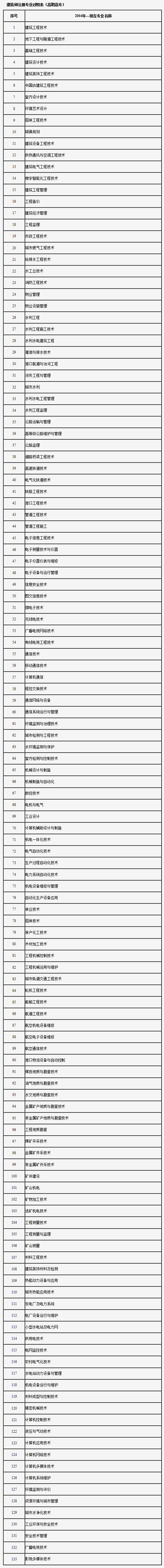 注:本表按教育部現(xiàn)行《普通高等學校高職高專教育指導性專業(yè)目錄(2005年版)》編制。共涉及“土建施工類、工程管理類、建筑設(shè)計類、城鎮(zhèn)規(guī)劃與管理類、建筑設(shè)備類、市政工程類、房地產(chǎn)類、水利工程與管理類、機械設(shè)計制造類、自動化類、電子信息類、通訊類、環(huán)保類、機電設(shè)備類、公路運輸類、鐵路運輸類、港口運輸類、管道運輸類、林業(yè)技術(shù)類、城市軌道運輸類、水上運輸類、民用運輸類、資源勘查類、水利水電設(shè)備類、地質(zhì)工程與技術(shù)類、礦冶工程類、礦物加工類、測繪類、材料類、能源類、電力技術(shù)、計算機類、安全類、廣播影視類”等34類133個專業(yè),其中本專業(yè)76個,相近專業(yè)57個。
