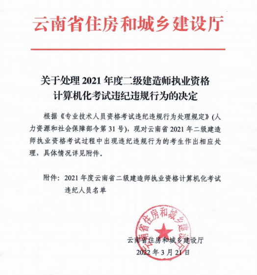 云南關(guān)于處理2021年度二級建造師考試違紀(jì)違規(guī)行為的決定