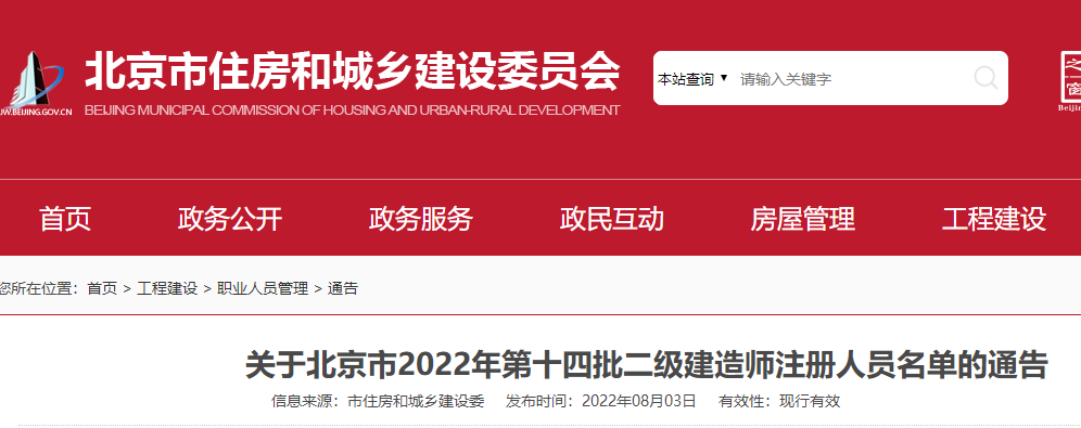 北京市2022年第十四批二級建造師注冊人員名單的通告
