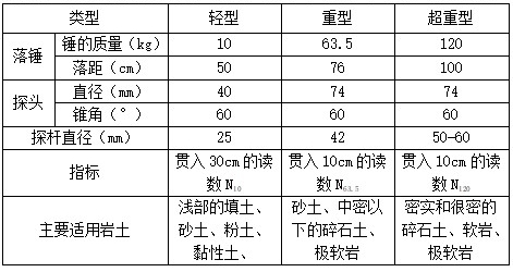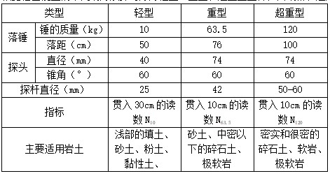 根據(jù)錘擊能量的不同動(dòng)力觸探可分為輕型、重型和超重型三種,其規(guī)格和適用土類如下:
