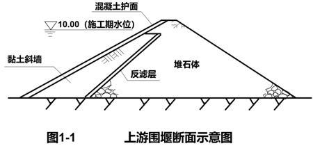 某新建中型攔河閘工程,施工期由上、下游填筑的土石圍堰擋水,其中上游圍堰斷面示意圖如圖1-1所示。