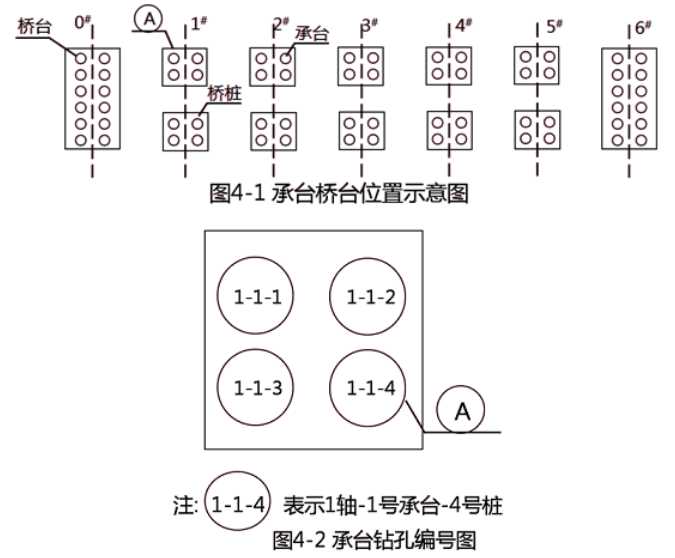 某公司項目部施工的橋梁基礎(chǔ)工程,灌注樁混凝土強(qiáng)度為C25,直徑1200mm,樁長18m,承臺、橋臺的位置如圖4-1所示,承臺的樁位編號如圖4-2所示。