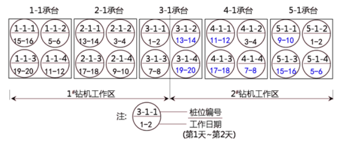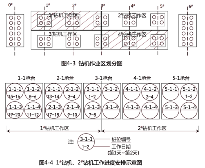 事件一:項目部依據(jù)工程地質(zhì)條件,安排4臺反循環(huán)鉆機(jī)同時作業(yè),鉆機(jī)工作效率(1根樁/2d)。在前12天,完成了橋臺的24根樁,后20天要完成10個承臺的40根樁。承臺施工前項目部對4臺鉆機(jī)作業(yè)劃分了區(qū)域,見圖4-3,并提出了要求:①每臺鉆機(jī)完成10根樁;②一座承臺只能安排1臺鉆機(jī)作業(yè);③同一承臺兩樁施工間隙時間為2天。1#鉆機(jī)工作進(jìn)度安排及2#鉆機(jī)部分工作進(jìn)度安排如圖4-4所示。