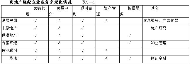 近年來,在房地產(chǎn)經(jīng)紀行業(yè)的不斷發(fā)展過程中,一部分實力品牌企業(yè)在市場競爭中脫穎而出,開始實行多元化發(fā)展戰(zhàn)略(見表3—1),打通了二三級市場的傳統(tǒng)隔閡,實行一二手聯(lián)動。原本從事新建商品房營銷代理的企業(yè)把漸漸把觸角伸向存量房租售,而不少房屋中介也開始試水新建商品房營銷代理。不僅如此,還基于傳統(tǒng)的經(jīng)紀業(yè)務開展顧問咨詢、信息服務、按揭服務、物業(yè)管理、資產(chǎn)管理等新型衍生業(yè)務。