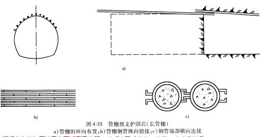 管棚是由鋼管和鋼拱架組成。沿著開(kāi)挖輪廓線,以較小的外插角,向開(kāi)挖面前方打人鋼管或鋼插板,末端支架在鋼拱架上,形成對(duì)開(kāi)挖面前方圍巖的預(yù)支護(hù)。其中長(zhǎng)度小于10m稱(chēng)為短管棚,10~45m的鋼管稱(chēng)為長(zhǎng)管棚。鋼管直徑一般為70-127mm,特殊情況下也可采用300mm或600mm直徑鋼管。縱向兩組管棚搭接的長(zhǎng)度應(yīng)大于3m.根據(jù)國(guó)內(nèi)外經(jīng)驗(yàn),一般在下列場(chǎng)合采用管棚超前支護(hù):
