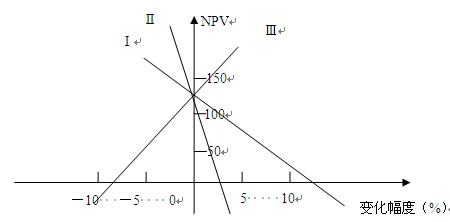 解析:該題考核的是不確定性因素的敏感度,采用的方法有兩種:1通過不同因素的直線斜率確定敏感度,斜率大者敏感;2通過比較不同因素的臨界點(diǎn)的絕對(duì)值,臨界點(diǎn)的絕對(duì)值小者敏感。根據(jù)這兩種方法,可以確定這三個(gè)不確定因素Ⅰ、Ⅱ、Ⅲ的敏感性從大到小的排列順序?yàn)棰?Ⅲ-Ⅰ。