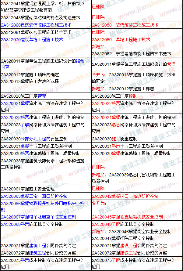6)將“單位工程竣工驗(yàn)收”由“了解”提高到“掌握”;“建筑工程竣工資料的編制”由“了解”提高到“熟悉”