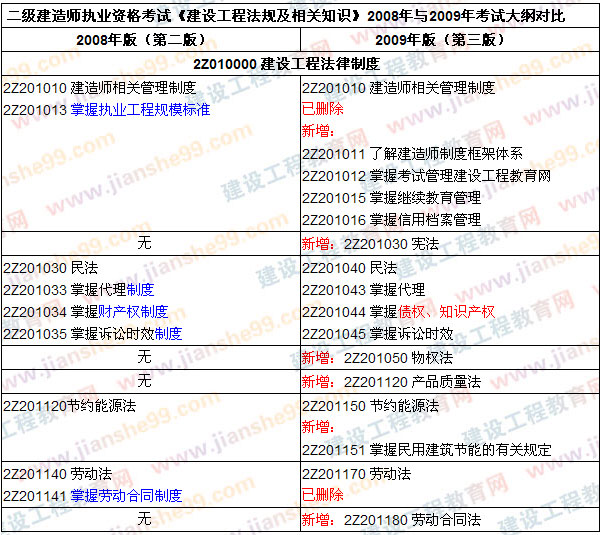 2009年版《建設工程法規(guī)及相關知識》大綱與教材的內(nèi)容相比較2008年版變化不是很大,但也在考試內(nèi)容上做了一些調(diào)整,如刪除了建設工程法律制度中刪除了執(zhí)業(yè)工程規(guī)模標準章節(jié),新增了建造師制度框架體系、建造師考試管理、繼續(xù)教育管理、信用檔案管理等,也新增了憲法相關知識點,并把代理制度的考核點轉(zhuǎn)變?yōu)閷Υ碇R的考核,而對財產(chǎn)權(quán)制度的考核轉(zhuǎn)變?yōu)閷?、知識產(chǎn)權(quán)的考核等。來源建設工程教育網(wǎng),轉(zhuǎn)載請注明出處!