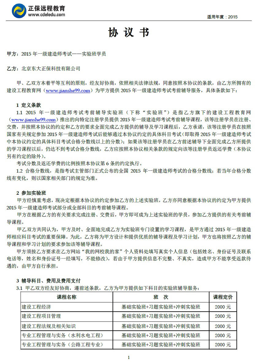 一級建造師“實(shí)驗(yàn)班”協(xié)議書