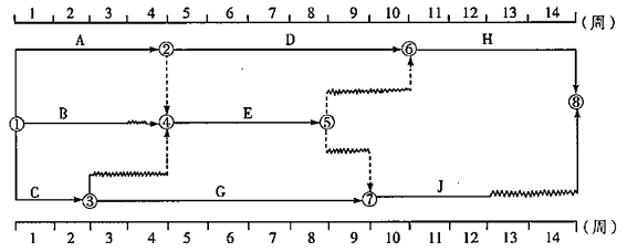 某工程項(xiàng)目雙代號時標(biāo)網(wǎng)絡(luò)計(jì)劃如下圖所示,其中工作E的總時差和自由時差,分別為( )周。
