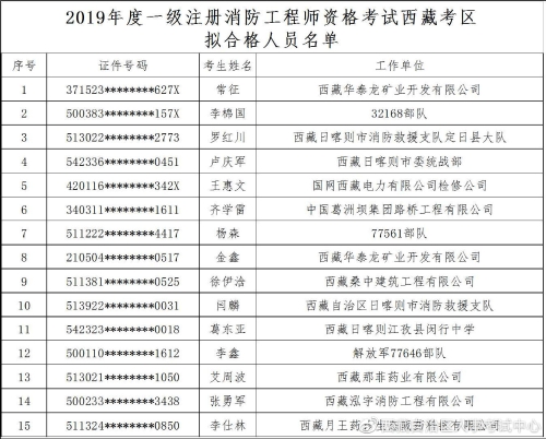 西藏2019年一級(jí)消防工程師資格考試成績(jī)合格、擬取得資格證書(shū)人員公示