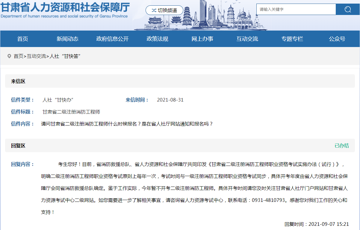 甘肅省人力資源和社會保障廳回復(fù)考生關(guān)于甘肅省二級注冊消防工程師報名相關(guān)問題,內(nèi)容如下: