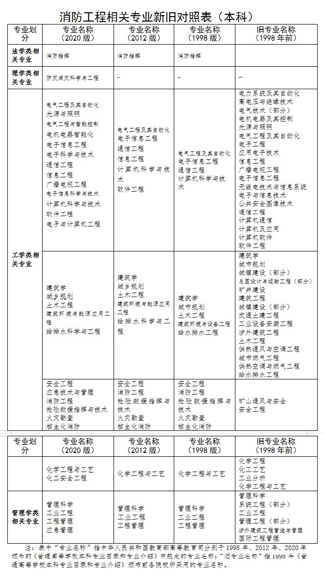 接上級部門通知,應(yīng)急管理部消防救援局對《關(guān)于印發(fā)注冊消防工程師制度暫行規(guī)定和注冊消防工程師資格考試實施辦法及注冊消防工程師資格考核認定辦法的通知》(人社部發(fā)〔2012〕56號)附件1中“消防工程相關(guān)專業(yè)新舊對照表”增加了相關(guān)內(nèi)容。