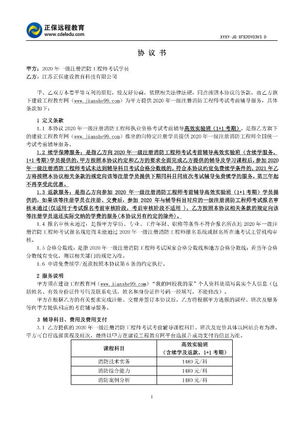 2020年一級注冊消防工程師高效實驗班協(xié)議書