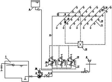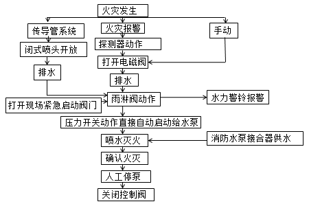 準(zhǔn)工作狀態(tài)時(shí),由穩(wěn)壓設(shè)施維持雨淋閥入口前管道內(nèi)充水的壓力?;馂?zāi)時(shí),由火災(zāi)自動(dòng)報(bào)警系統(tǒng)或傳動(dòng)管自動(dòng)控制開啟雨淋報(bào)警閥和供水泵,向系統(tǒng)管網(wǎng)供水,由雨淋閥控制的開式噴頭同時(shí)噴水。
